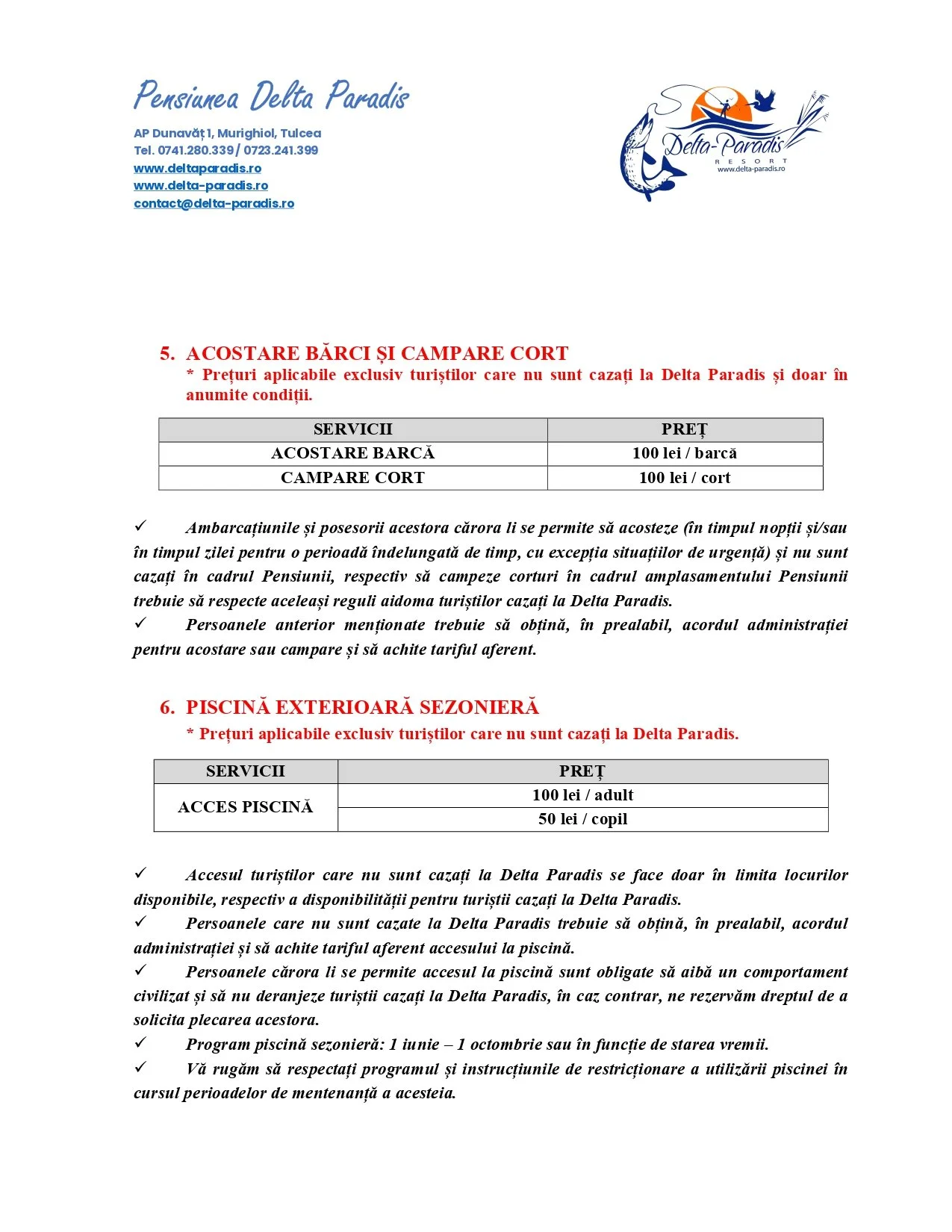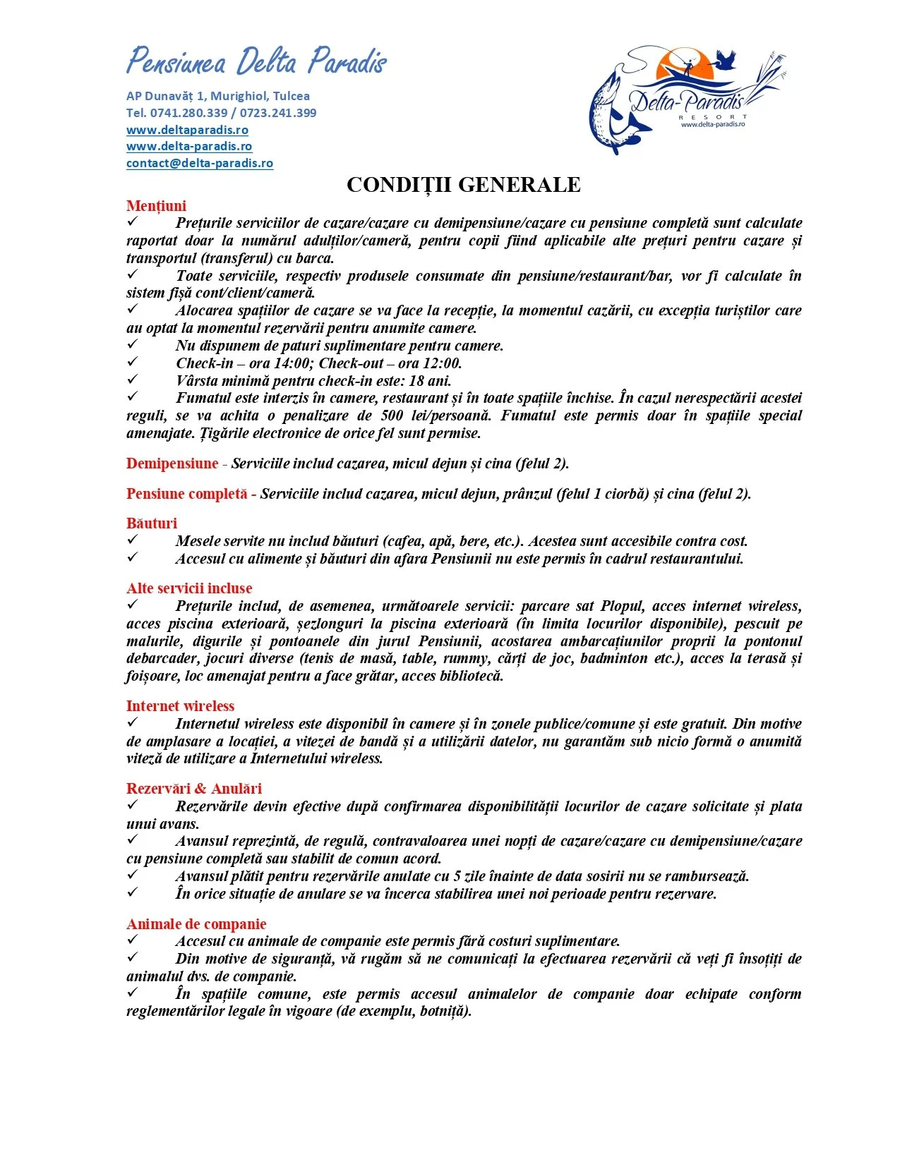 AICI PUTEȚI CONSULTA CONTRACTUL CU TURIȘTII PERSOANE FIZICE. CONTRACTUL POATE FI NEGOCIAT FIIND SUPUS UNOR TERMENI ȘI CONDIȚII. Precizări pentru agențiile de turismRezervarea spațiilor de cazare se face pe baza comenzii tip (cerere ofertă), în formă scrisă (e-mail pe adresa: [email protected]) emisă de către agenția de turism, acceptată și calculată de Pensiune. Rezervările trebuie reconfirmate cu 3 zile înaintea începerii sejurului turiștilor individuali și cu 7 zile înainte, în cazul grupurilor.Comisionul cedat agenției de turism este conform contractului semnat între părți. Nu cedăm comision agențiilor care nu au încheiat contract cu ADVADELT TURISM S.R.L sau DELTA PENSION S.R.L.Aici puteți consulta contractul cu agențiile de turism. Contractul poate fi negociat. Închirieri autoturisme prin EUROPCAR ROMÂNIA